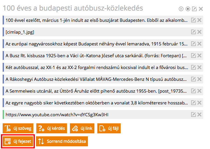 Új fejezetet az ‘Új fejezet’ gombbal tudunk létrehozni, amely a tananyag fő szerkesztőfelületén található. Amennyiben a tananyag már tartalmaz fejezeteket és tartalmakat, az 'Új fejezet létrehozása' gomb az oldal legalján található. Itt meg kell adni az új fejezet nevét, és az megjelenik a tananyagban. Ezzel a különböző szekciókat, témaköröket választhatjuk el, átláthatóbbá téve így a tananyagot.